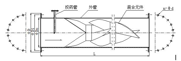如圖所示,管式混合器由投藥管、混合元件和外管組成。投藥管置于混合器上游,原水加藥劑后,經(jīng)過(guò)各混合元件時(shí)產(chǎn)生